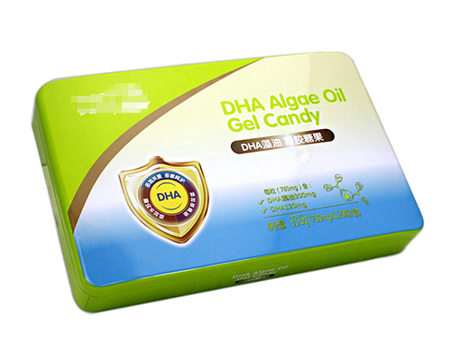此款DHA凝膠糖果鐵盒包裝采用方形外型,內卷線蓋,身縮口,扣底蓋結構,使其密封性能得到進一步的提升,盒身為一片鐵沖壓制成,經過扣骨處理,無飛邊劃手現象。底部為外卷線鑼底。350*220*55mm的規格尺寸,您也可以定制圓形、異形、三角形等其它精致盒型,多樣化的滿足您對鐵盒方面的要求。